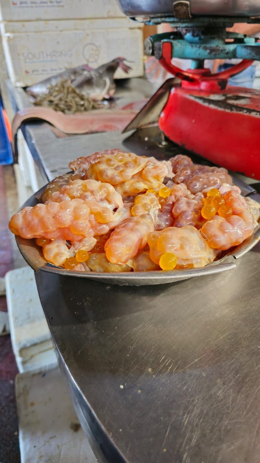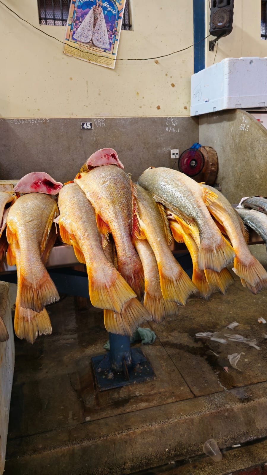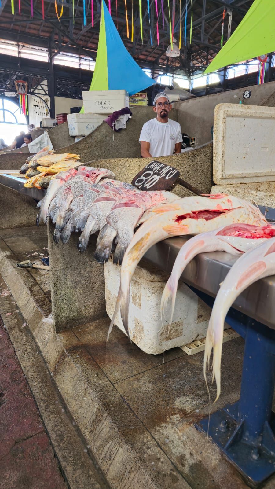 O setor de pescados do mercado é outro ponto de destaque, com espécies como pirarucu, tambaqui e filhote chegando frescas diariamente.
